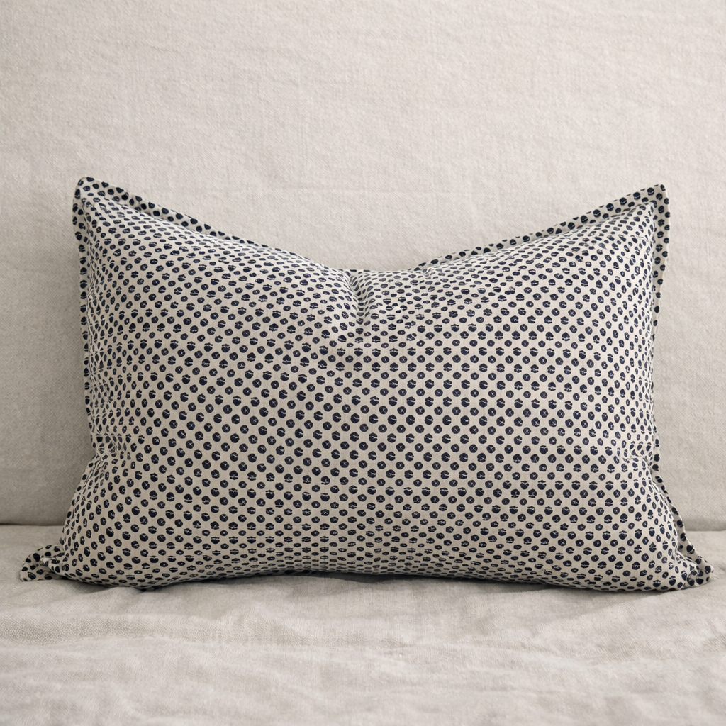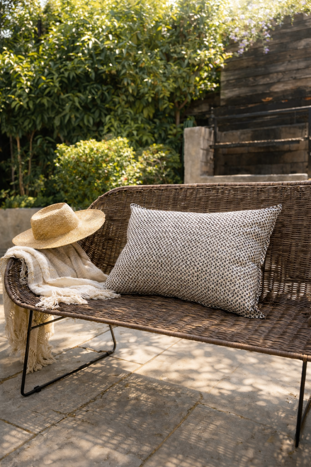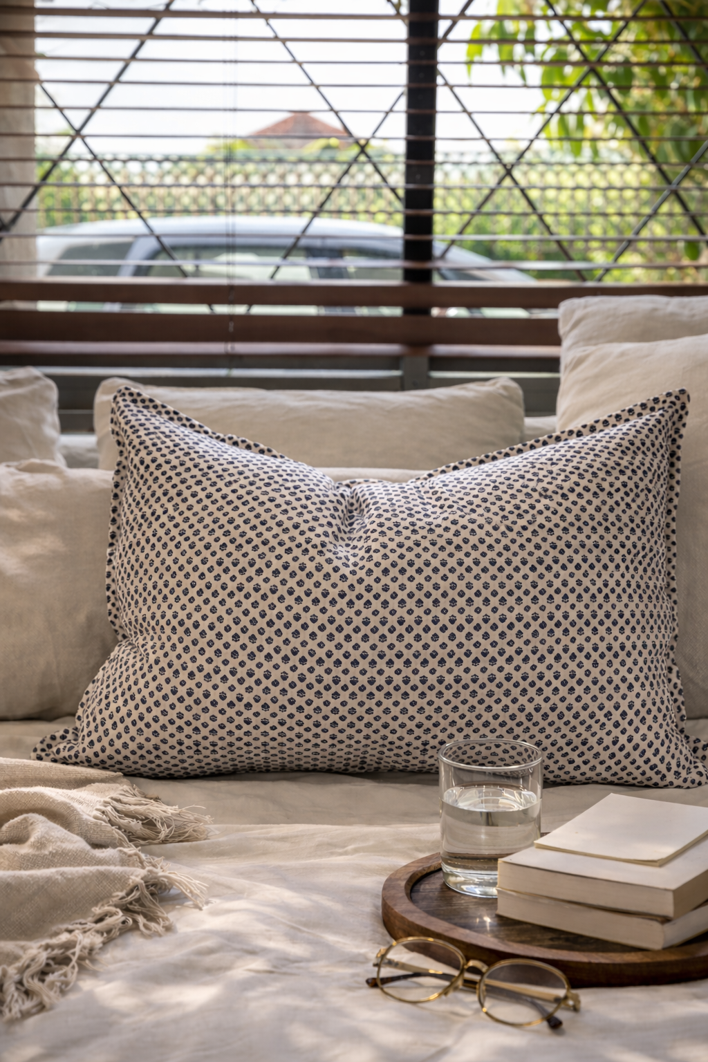 Cojín rectangular confeccionado a mano en algodón 100% estampado, ideal para aportar ritmo y frescura a la composición. Su formato lumbar es perfecto para complementar cojines cuadrados.
