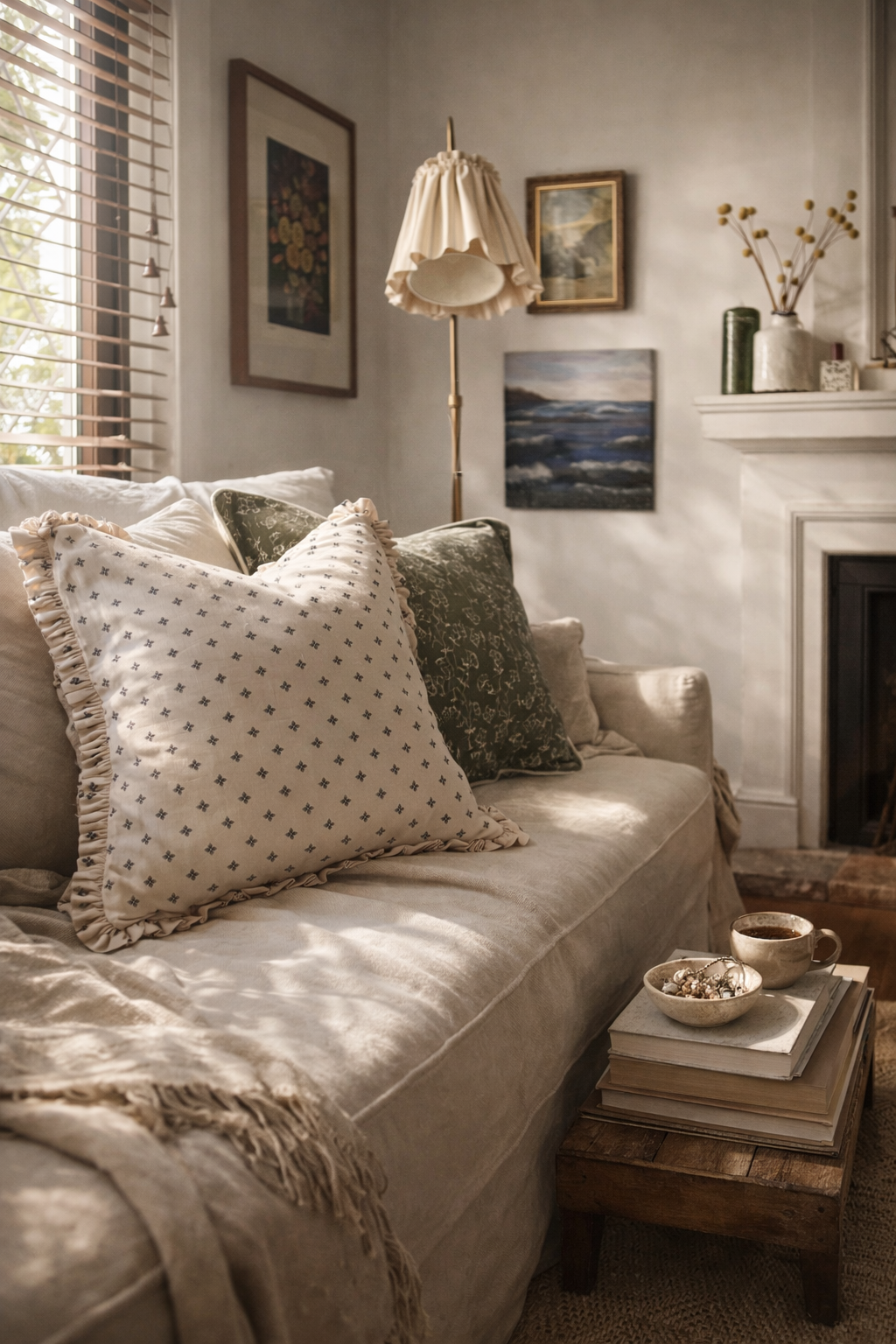 Cojín confeccionado a mano en algodón 100% estampado en tonos neutros, pensado para sumar textura sin recargar. Sus ruffles perimetrales aportan suavidad visual y un acabado delicado.