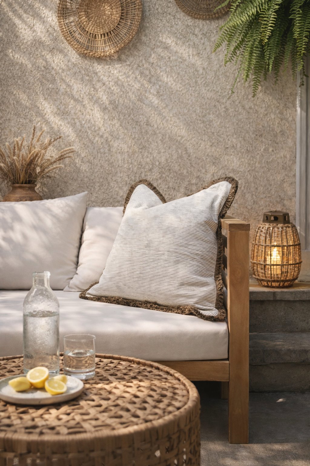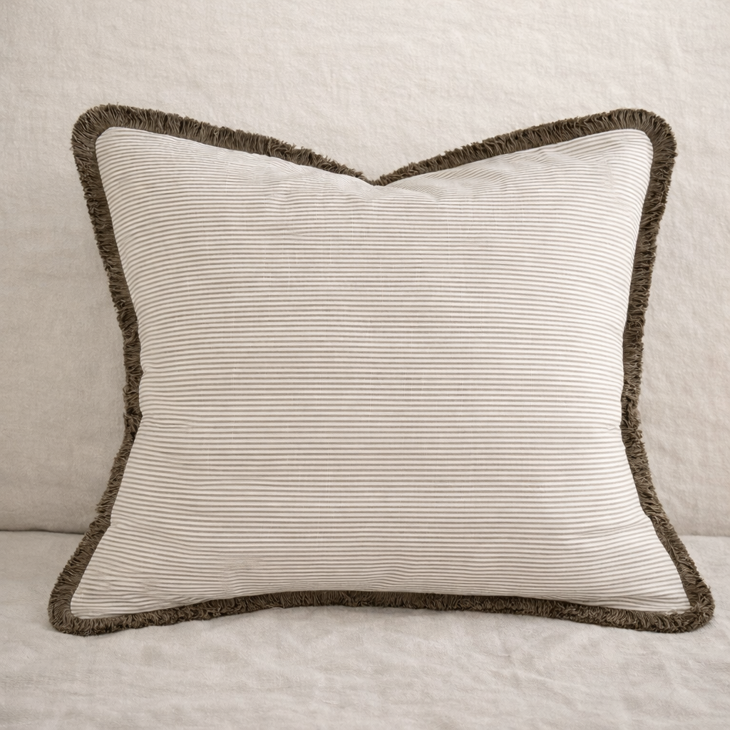 Cojín confeccionado a mano en lino natural con terminación desflecada perimetral. Aporta textura y un aire relajado, ideal para equilibrar cojines estampados o con ruffles.