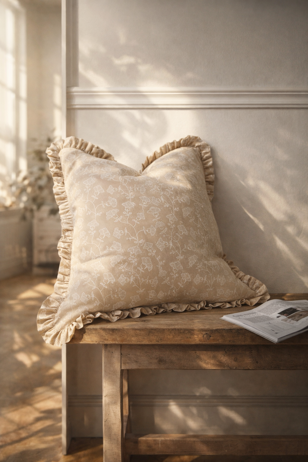 Cojín confeccionado a mano en algodón 100% estampado, pensado para aportar suavidad y una estética delicada a camas y rincones especiales. Su floral en tonos beige y ruffles perimetrales crea una pieza luminosa y serena.