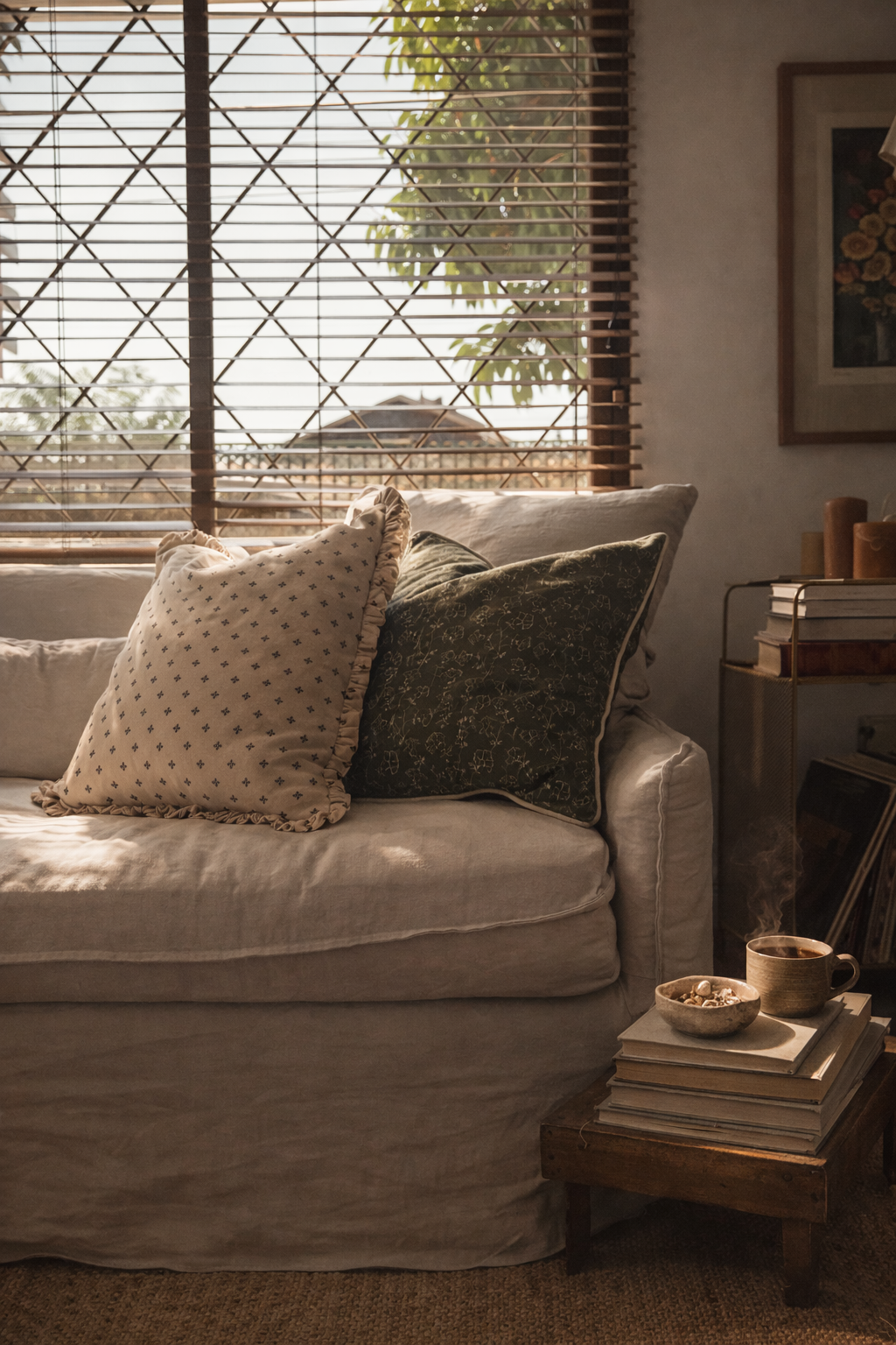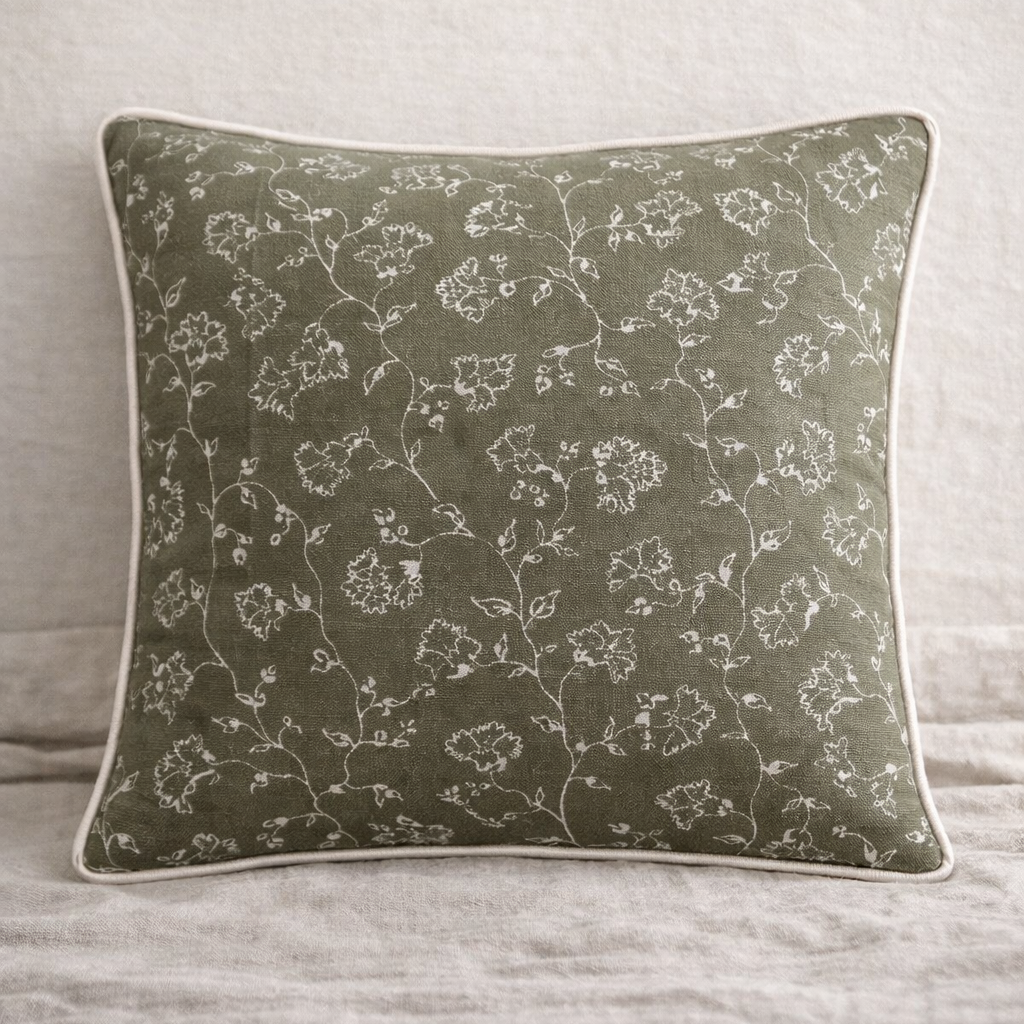 Cojín confeccionado a mano en algodón 100% estampado, con delicado diseño floral verde y terminación con piping que aporta estructura y definición. Una pieza versátil para combinar con ruffles, rayas o neutros.