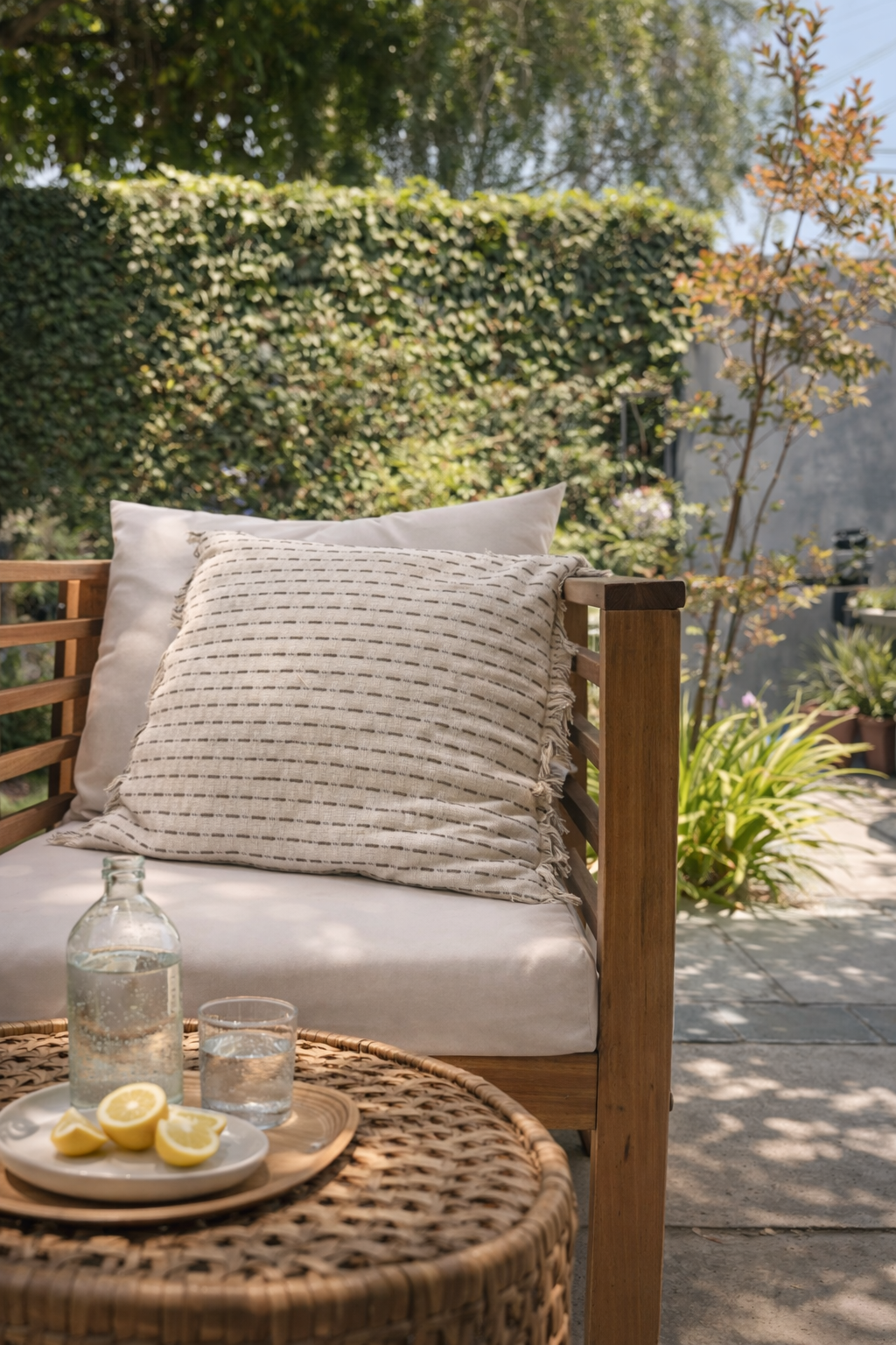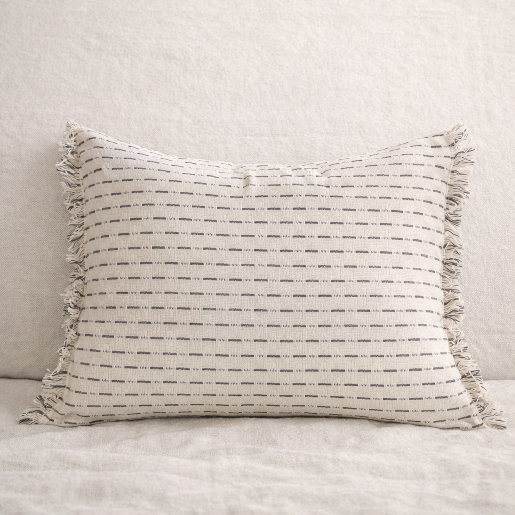 Cojín rectangular confeccionado a mano en lino natural con terminación desflecada. Aporta textura y un aire orgánico, ideal para equilibrar composiciones con estampados.