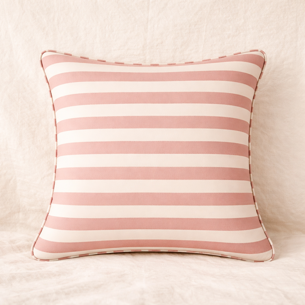 Funda cojín de 50x50cm rayas rosa y borde de la misma tela. Materialidad lona, ideal para terrazas y aire libre.
