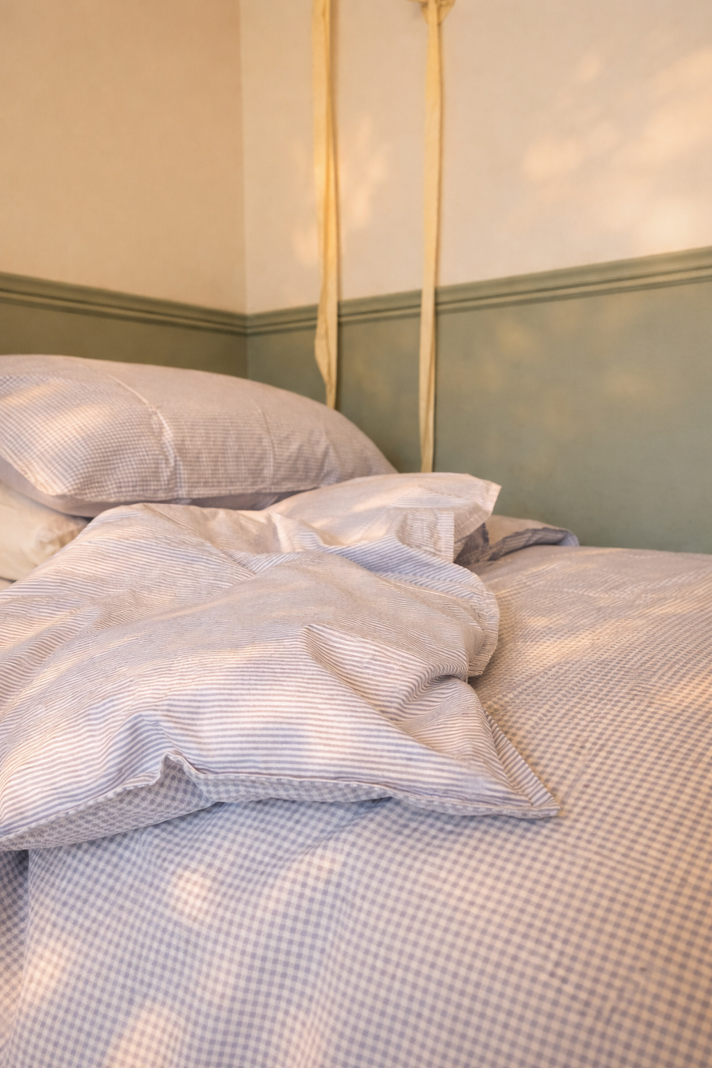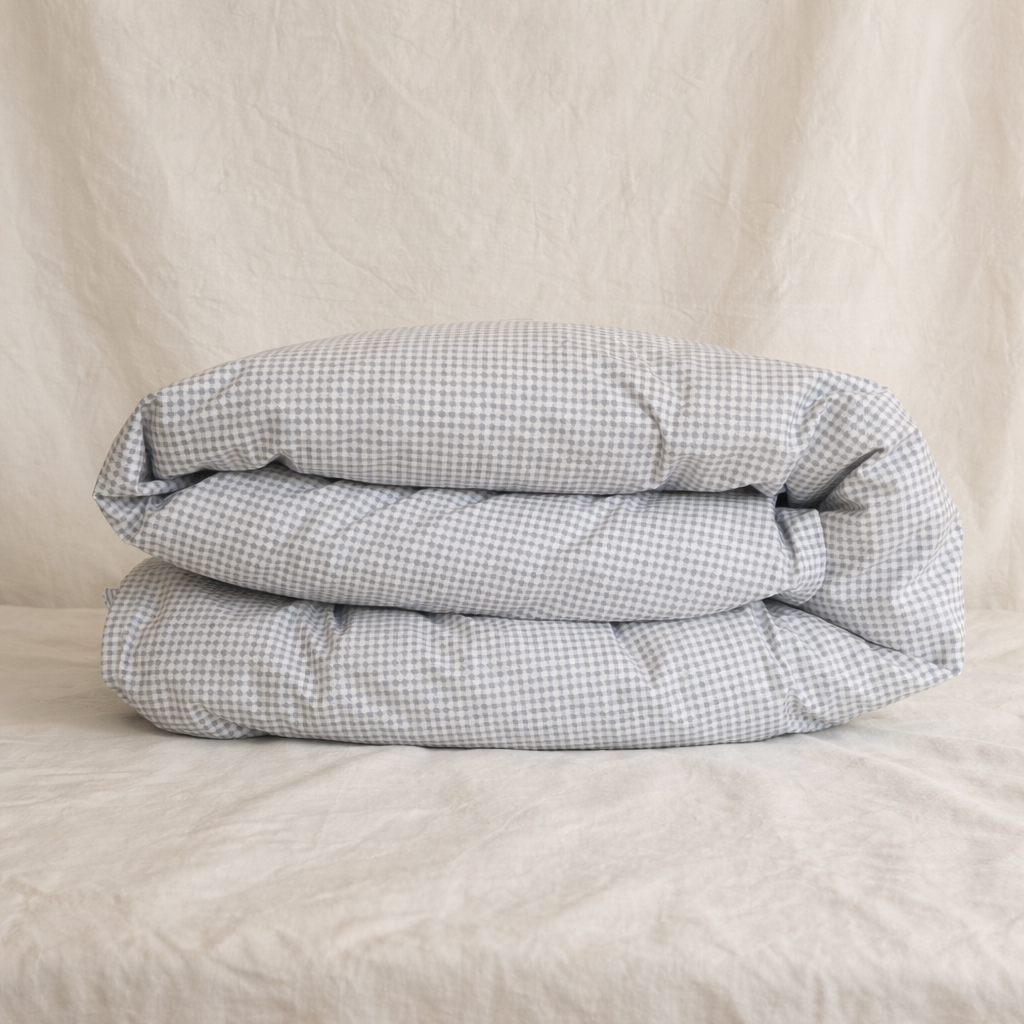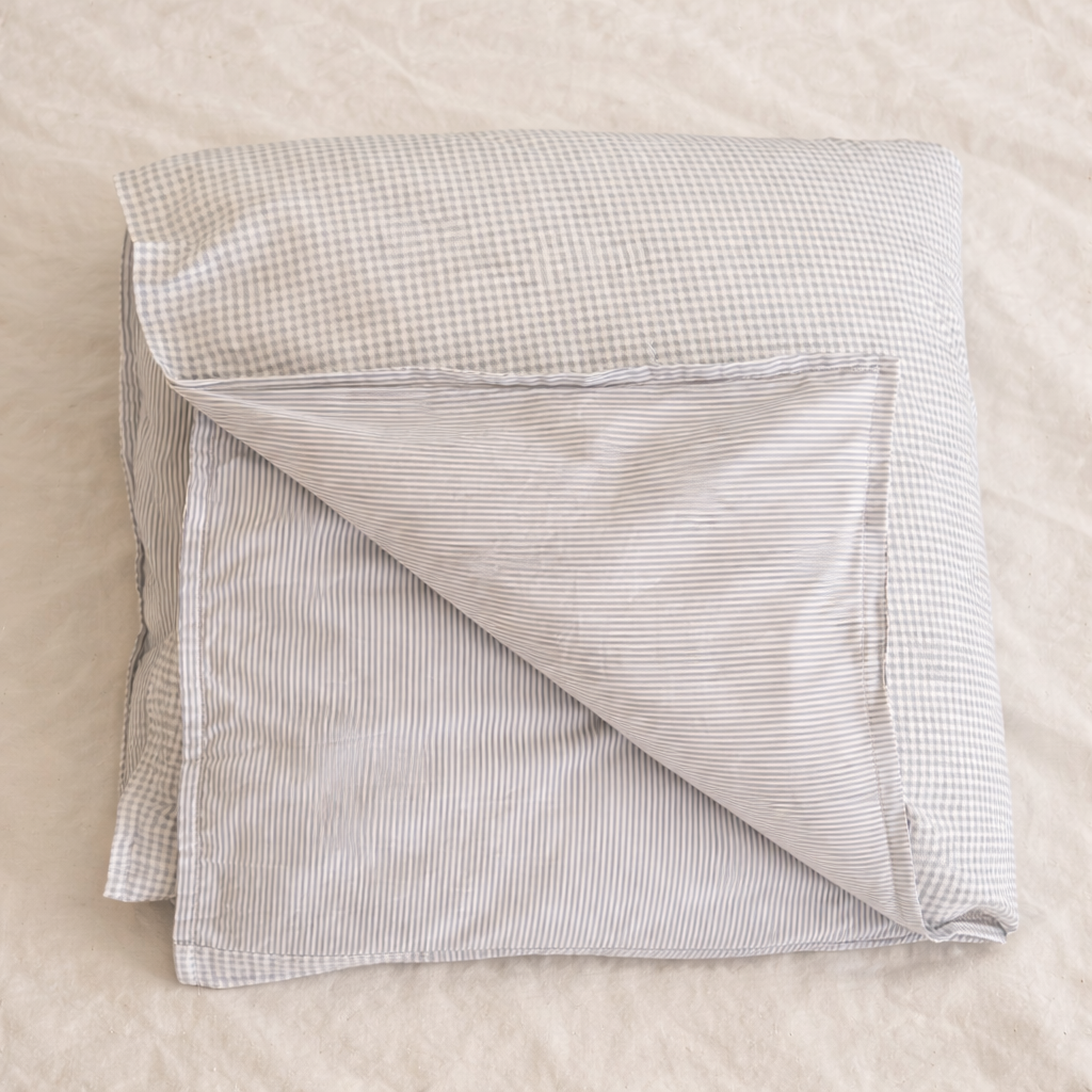Nuestro cubreplumón reversible está pensado para crear una cama acogedora y llena de encanto. Con un delicado estampado vichy azul suave por un lado y finas rayas en el mismo tono por el otro, permite cambiar el estilo de la cama con solo voltearlo, manteniendo siempre una estética clásica y atemporal.
