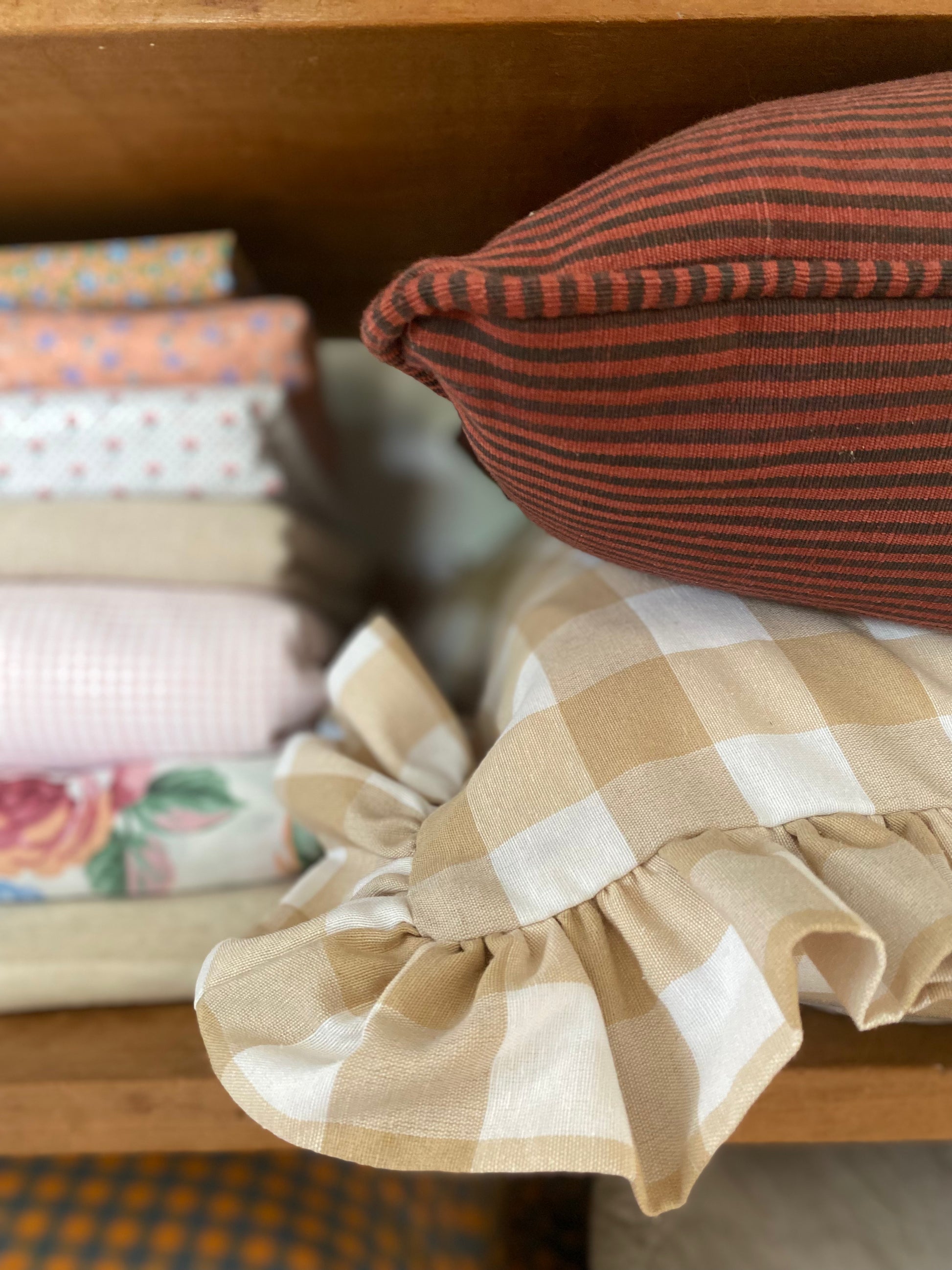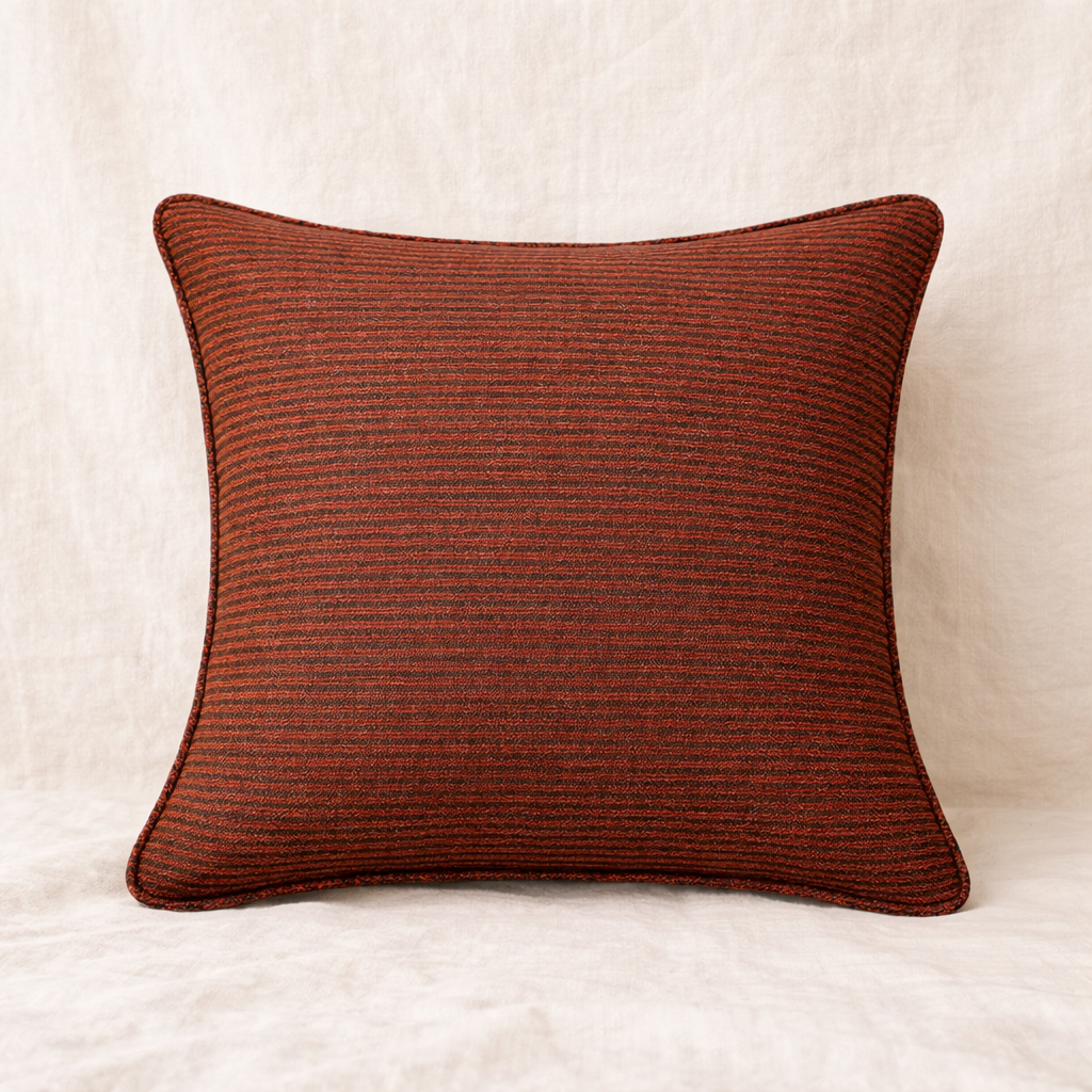 Funda de cojín de 50x50 cm hecha en 100% algodón. Presenta un diseño de finas rayas burdeo con azul marino y un borde de la misma tela. Aporta un estilo clásico y atemporal