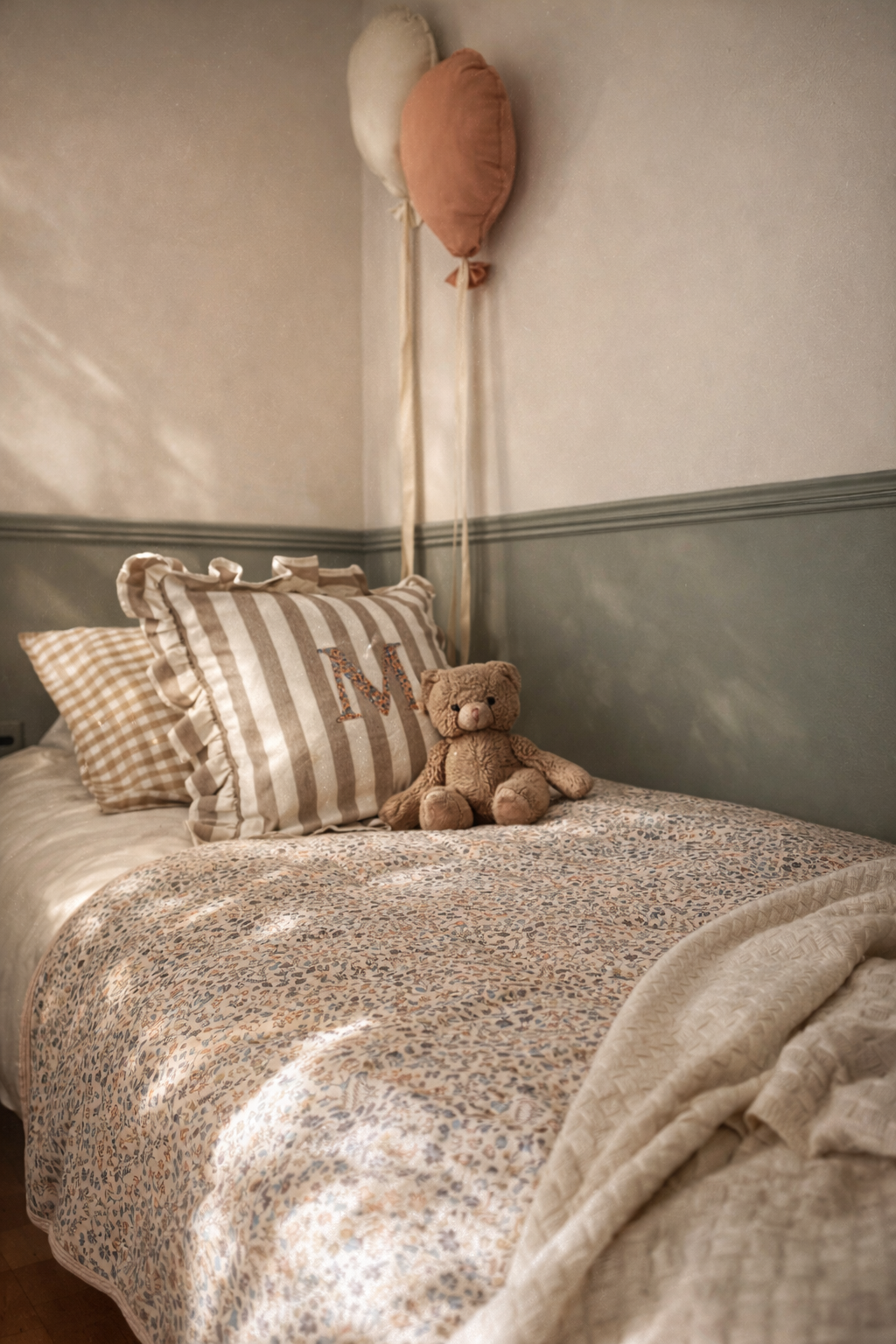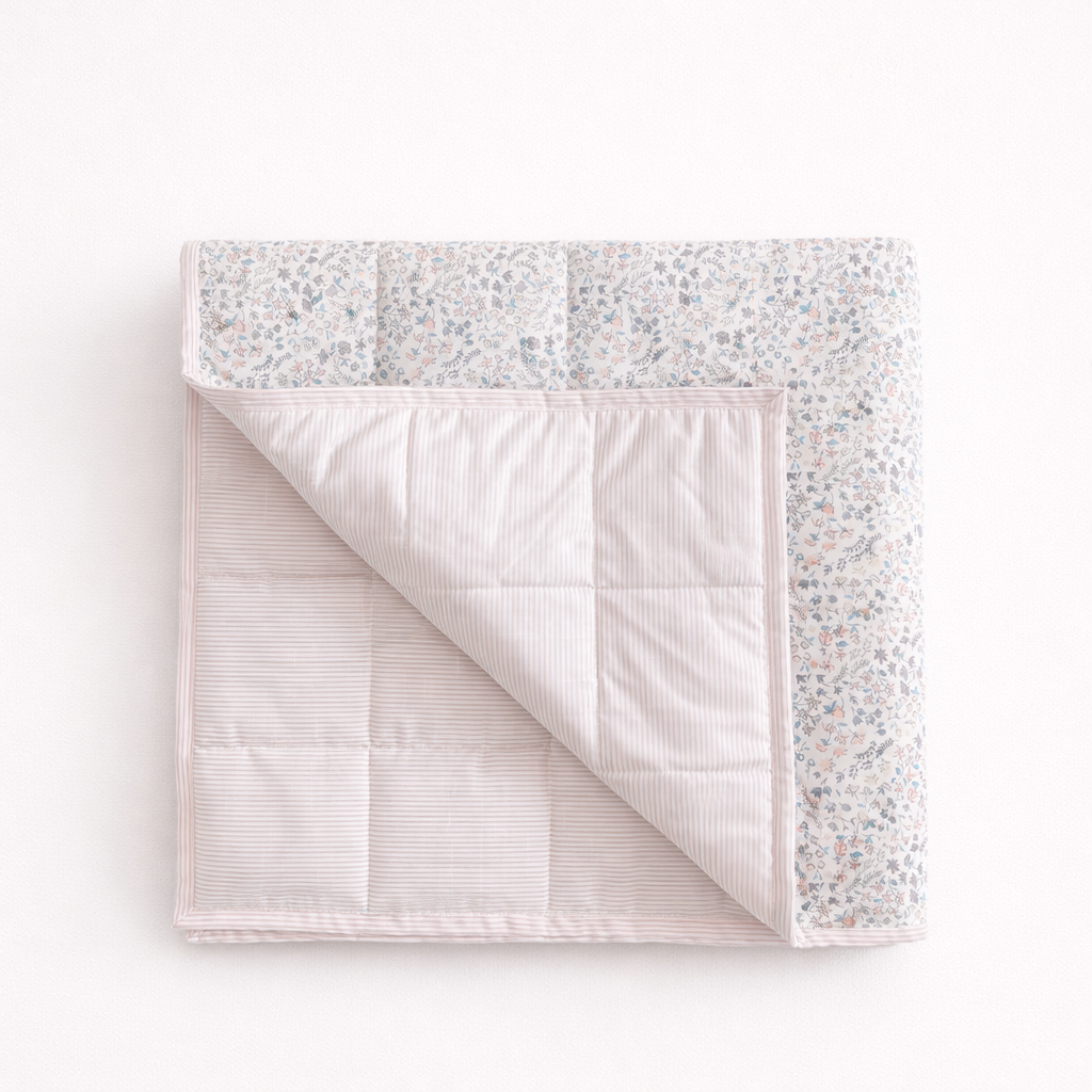 Quilt confeccionado a mano en algodón 100% estampado, con floral en tonos rosados que aporta calidez y delicadeza al dormitorio. Una pieza protagonista, suave y versátil.